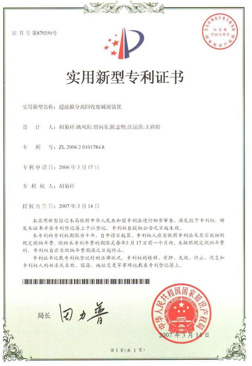 工業(yè)廢堿液回收再生裝置國家專利證書